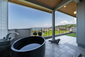 こんなにも急に寒くなってくると、暑くて暑くて大変だった夏を恋しく思います。暑い時は秋が待ち遠しかったり、寒くなると夏を恋しく感じたり、四季があるからこその楽しみでもあります。この夏、お引き渡しから7年が経つお客様宅へお伺いしました。海の見える高台でまさに季節を楽しむことのできるお宅。玄関を開けると奥には海が広がり、一歩足を踏み入れるとゾート気分に。海で遊んだ後、さっとシャワーを浴びられるようにとテラスには露天風呂も。